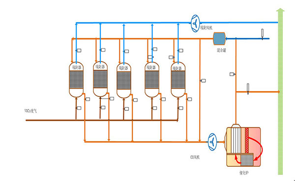 總吸(xi)附風量:100000m3/h,共5臺活性(xing)炭吸(xi)附設備,四吸(xi)一脫;