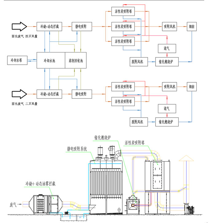 因(yin)廢氣中風(feng)量大、濃(nong)度低,且工作時間不(bu)連(lian)續,如選用(yong)(yong)直接燃燒,建設成本太大,運行費用(yong)(yong)也十分昂貴。綜合考慮現今主流處理(li)處理(li)工藝,我們采用(yong)(yong)冷凝+靜(jing)電吸(xi)附(fu)+活性炭吸(xi)附(fu)濃(nong)縮-催(cui)化燃燒設備(再生脫附(fu))的工藝來處理(li)生產(chan)尾氣。