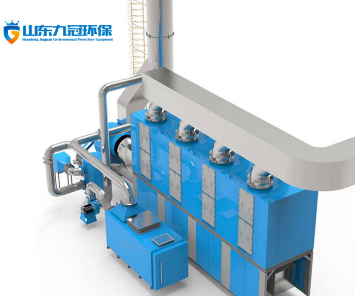 3.脫(tuo)附(fu)階段:經過(guo)(guo)(guo)理(li)論計(ji)算(suan)以(yi)及現(xian)場(chang)統(tong)計(ji)測算(suan),達到吸(xi)附(fu)床(chuang)吸(xi)附(fu)飽和時間(jian)后,關閉吸(xi)附(fu)箱進(jin)(jin)出口閥(fa)門(men)。啟動(dong)脫(tuo)附(fu)風機對該吸(xi)附(fu)床(chuang)脫(tuo)附(fu),脫(tuo)附(fu)氣(qi)(qi)體(ti)首先(xian)經過(guo)(guo)(guo)催(cui)化(hua)床(chuang)中(zhong)的(de)(de)換(huan)熱(re)(re)器,然后進(jin)(jin)入催(cui)化(hua)床(chuang)中(zhong)的(de)(de)預(yu)熱(re)(re)器,在(zai)電加(jia)熱(re)(re)器的(de)(de)作用(yong)下,使氣(qi)(qi)體(ti)溫度提高到320℃以(yi)上,再通過(guo)(guo)(guo)催(cui)化(hua)劑(ji)(ji),有機物質在(zai)催(cui)化(hua)劑(ji)(ji)的(de)(de)作用(yong)下燃燒,被分(fen)(fen)解(jie)為(wei)CO2和H2O,同時放(fang)出大量(liang)的(de)(de)熱(re)(re),氣(qi)(qi)體(ti)溫度進(jin)(jin)一(yi)(yi)部(bu)提高,該高溫氣(qi)(qi)體(ti)再次(ci)通過(guo)(guo)(guo)換(huan)熱(re)(re)器,與進(jin)(jin)來的(de)(de)冷(leng)風換(huan)熱(re)(re),回(hui)收一(yi)(yi)部(bu)分(fen)(fen)熱(re)(re)量(liang)。從(cong)換(huan)熱(re)(re)器出來的(de)(de)氣(qi)(qi)體(ti)分(fen)(fen)兩部(bu)分(fen)(fen):一(yi)(yi)部(bu)分(fen)(fen)直(zhi)接排空;另一(yi)(yi)部(bu)分(fen)(fen)進(jin)(jin)入吸(xi)附(fu)床(chuang)對活性(xing)(xing)炭(tan)進(jin)(jin)行(xing)脫(tuo)附(fu)。當脫(tuo)附(fu)溫度過(guo)(guo)(guo)高時可控(kong)制補(bu)冷(leng)風閥(fa)進(jin)(jin)行(xing)補(bu)冷(leng),使脫(tuo)附(fu)氣(qi)(qi)體(ti)溫度控(kong)制在(zai)一(yi)(yi)個合適的(de)(de)范圍內。活性(xing)(xing)炭(tan)吸(xi)附(fu)床(chuang)內設有自動(dong)應(ying)急(ji)降(jiang)溫保護系(xi)統(tong),當脫(tuo)附(fu)溫度超高時,自動(dong)啟用(yong)應(ying)急(ji)降(jiang)溫系(xi)統(tong),達到降(jiang)溫的(de)(de)作用(yong)。