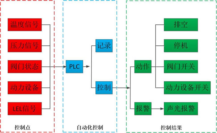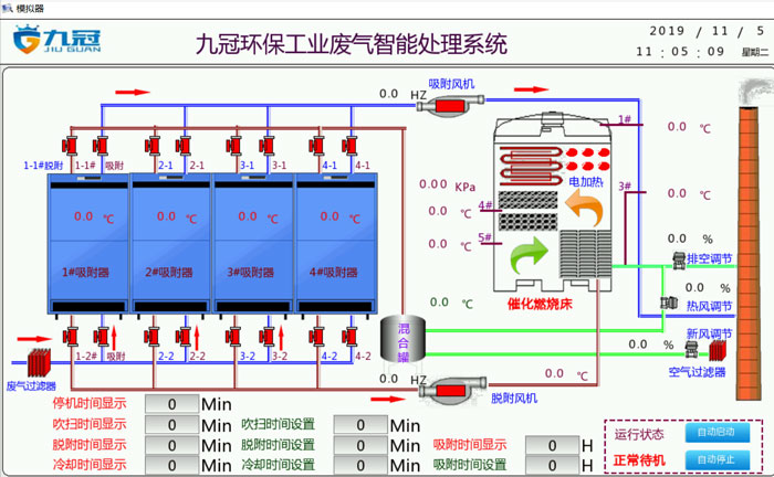 廢氣處理設(she)置(zhi)控(kong)制系統(tong)采用PLC系統(tong),具(ju)備設(she)備工況監(jian)視(shi)、流(liu)程畫面顯(xian)示(shi)、參數顯(xian)示(shi)、報(bao)警顯(xian)示(shi)、自動連鎖保護、 數據顯(xian)示(shi)等功(gong)能(neng),并設(she)有緊急停(ting)車(che)功(gong)能(neng)。系統(tong)的運(yun)行狀(zhuang)態(tai)設(she)置(zhi)正常運(yun)行模式、手動模式。
