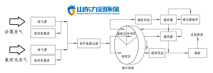因廢(fei)氣中風量大(da)、濃度(du)低,且工作時間不連續,如選用(yong)直接燃燒,建設(she)成本(ben)太大(da),運行費用(yong)也十分昂貴。綜合考慮現今(jin)主流處理處理工藝,我(wo)們采用(yong)干式(shi)過濾裝置+沸(fei)石轉輪(吸附)-催化(hua)燃燒設(she)備(再生(sheng)脫附)的工藝來(lai)處理生(sheng)產尾氣。