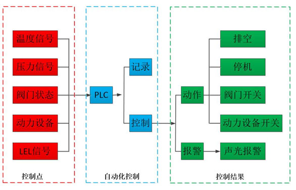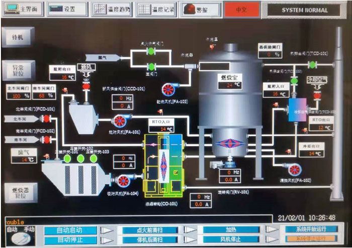 廢氣(qi)處(chu)理(li)設(she)置控制系統(tong)采用PLC系統(tong),具備設(she)備工況監視、流程畫(hua)面顯(xian)示、參數(shu)顯(xian)示、報警(jing)顯(xian)示、自動連鎖保(bao)護、 數(shu)據顯(xian)示等功能,并設(she)有緊急停車功能。系統(tong)的運行(xing)狀態設(she)置正常運行(xing)模式(shi)(shi)、手動模式(shi)(shi)。
